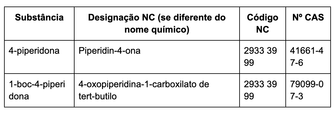 As substâncias recentemente incluídas na lista de precursores de drogas regulados pela União Europeia são a 4-piperidona e seu derivado 1-boc-4-piperidona.